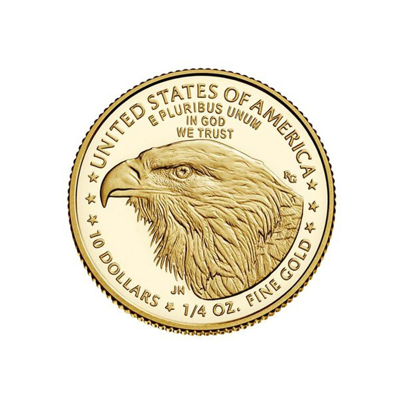 Na stronie przedniej (awersie) znajduje się klasyczne przedstawienie Lady Liberty – bogini wolności – ukazana z profilu, otoczona napisem „LIBERTY” oraz rokiem wybicia. Rewers natomiast zdobi dynamiczny wizerunek amerykańskiego orła w locie, unoszącego się nad gniazdem – symbol siły i opieki nad rodziną. Towarzyszą mu napisy: „UNITED STATES OF AMERICA”, oznaczenie wagi „1/4 OZ.” oraz wartość nominalna „10 DOLLARS”.