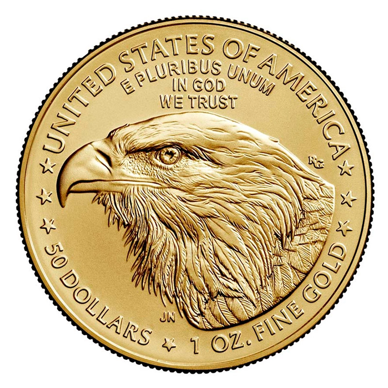 Rewers monety ukazuje majestatycznego orła, który został zaprojektowany z myślą o jeszcze większym realizmie i precyzji detali. Wokół znajdują się charakterystyczne inskrypcje: UNITED STATES OF AMERICA, E PLURIBUS UNUM, IN GOD WE TRUST, a także oznaczenie wartości nominalnej (50 DOLLARS) oraz zawartości kruszcu (1 OZ. FINE GOLD).