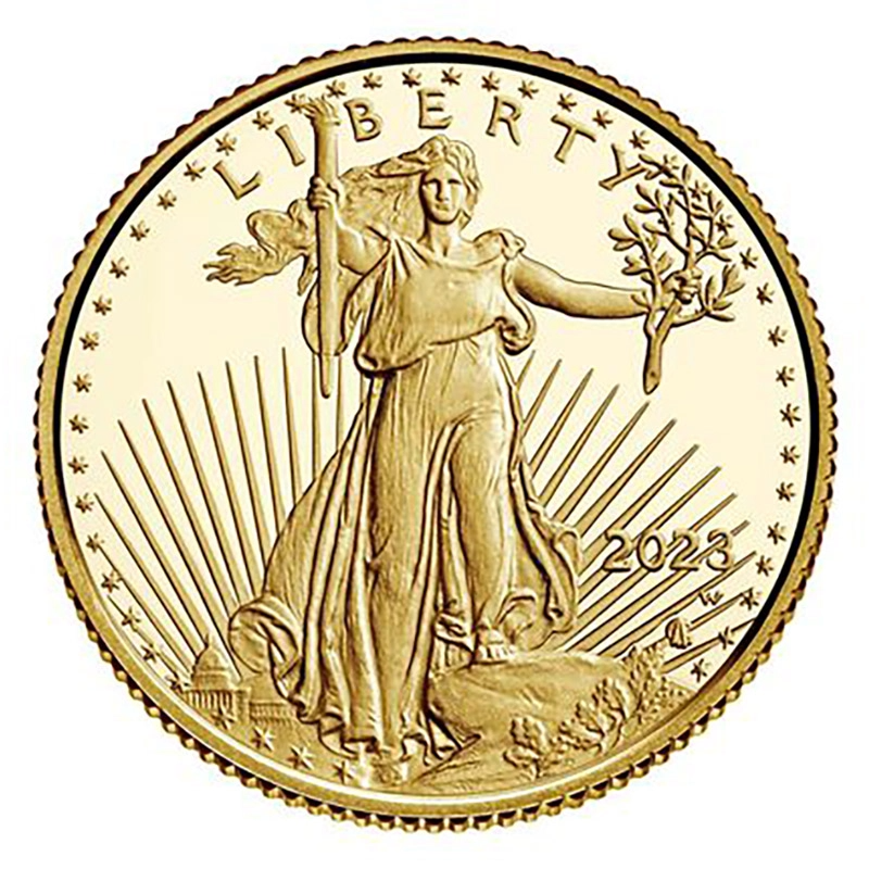 Awers złotej monety Amerykański Orzeł przedstawia zaktualizowaną wersję legendarnego projektu autorstwa Augustusa Saint-Gaudensa. Ukazuje on postać Liberty – kobiety w długiej sukni z warkoczami, trzymającej w prawej dłoni pochodnię, a w lewej gałązkę oliwną – symbol pokoju i wolności. To ikoniczne przedstawienie od lat symbolizuje ducha Stanów Zjednoczonych.