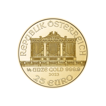 Złota moneta Wiedeński Filharmonik o wadze 1/4 uncji to prestiżowy produkt bulionowy emitowany przez renomowaną Mennicę Austriacką (Münze Österreich). Zawiera dokładnie 1/4 uncji trojańskiej czystego złota, czyli około 7,78 grama, i posiada wartość nominalną 25 euro. Moneta ta jest jedną z nielicznych europejskich monet bulionowych wyrażoną w euro, co zwiększa jej rozpoznawalność na rynkach międzynarodowych.
